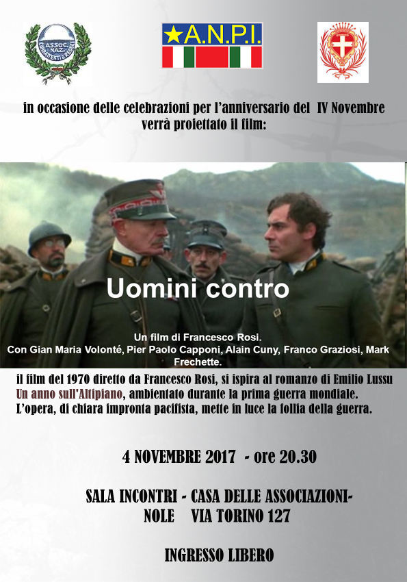 L'ANPI e l'Associazione Nazionale Combattenti e Reduci (ANCR) di Nole, in occasione della ricorrenza del IV Novembre" organizzano per sabato 4 novembre 2017 la proiezione del film "Uomini Contro", un film del 1970 di Francesco Rosi su un episodio della prima guerra mondiale, tratto dal libro di Emilio Lussu "Un anno sull'altipiano".