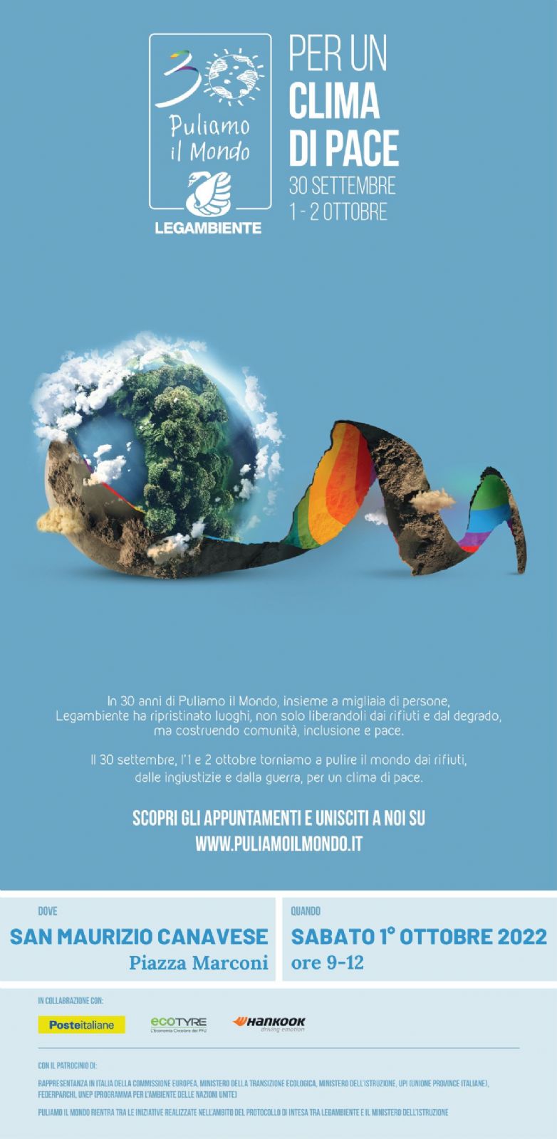 Anche quest'anno il Comune di San Maurizio Canavese partecipa a “Puliamo il mondo” di Legambiente, edizione italiana di Clean up the World, il più grande appuntamento di volontariato ambientale del mondo. L'obiettivo, com'è ormai noto a tutti, è ripulire parchi, giardini, fiumi, strade e piazze delle nostre città, coinvolgendo volontari di ogni età, adulti e bambini, che si ritrovano insieme per un gesto pratico e di grande utilità, ma ancor più simbolico e dal forte valore di sensibilizzazione nei confronti dell'intera comunità.