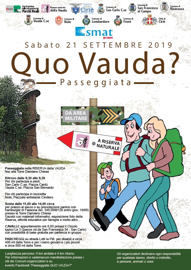 I Comuni di Nole, San Carlo C.se, Ciriè, Front, Lombardore, Vauda C.se, Rivarossa, S.Francesco al Campo, in collaborazione con l'Ente di Gestione delle aree protette dei Parchi Reali, Riserva naturale della Vauda e Sezione UGET di Ciriè organizzano per Sabato 21 settembre 2019 "QUO VAUDA?", passeggiata nella riserva naturale della Vauda fino alla torre "Damiano Chiesa".