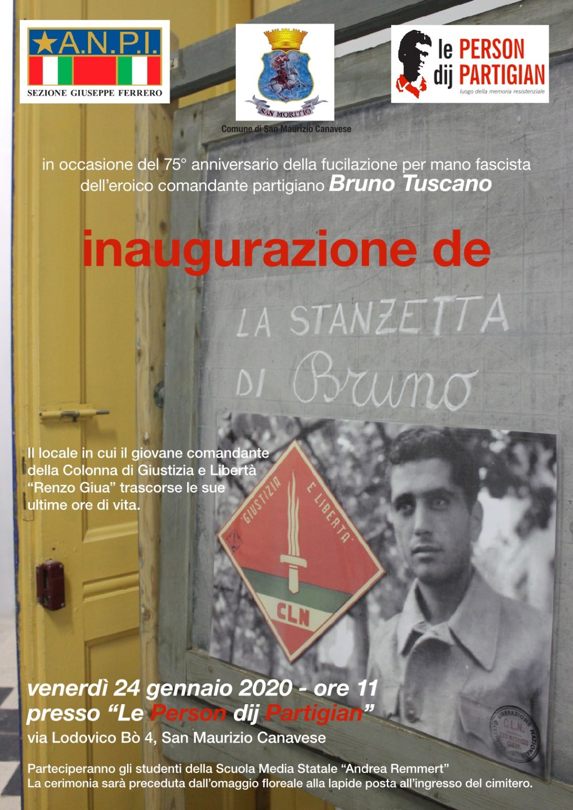 Venerdì 24 gennaio alle ore 11, nel 75° anniversario della fucilazione di Bruno Toscano, presso le Person dij Partigian (via Bo, 4) sarà inaugurata "La stanzetta di Bruno", il locale in cui il giovane comandante partigiano trascorse le sue ultime ore di vita. Parteciperanno gli alunni della scuola media "Andrea Remmert".