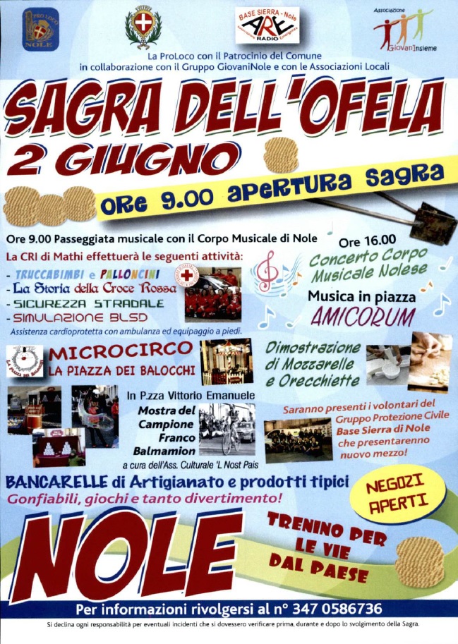 La Pro Loco di Nole, con la collaborazione dei Vigili del Fuoco volontari di Nole, Associazione Radio Emergenza Base Sierra e Associazione Giovaninsieme organizza la tradizionale "Sagra dell'ofela".