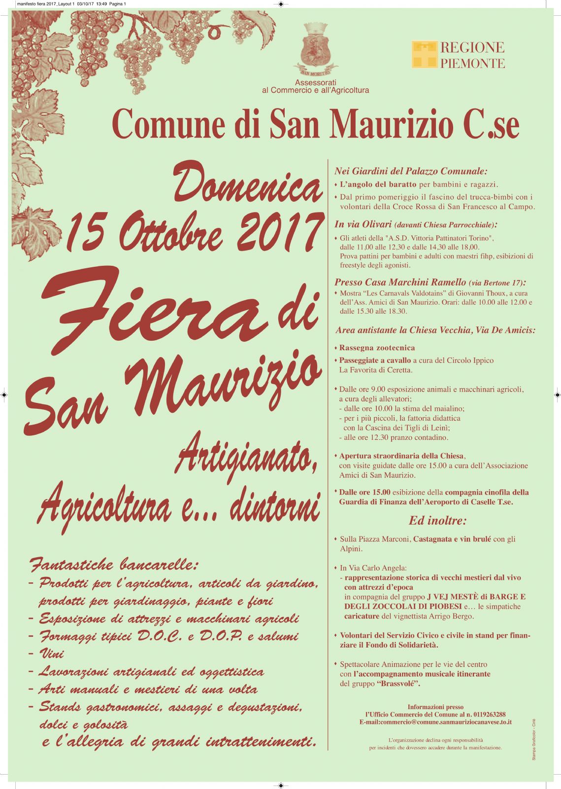 Domenica 15 ottobre, tradizionale appuntamento con la Fiera di San Maurizio "Artigianato, Agricoltura e dintorni", organizzata dagli Assessorati al Commercio e all'Agricoltura del Comune di San Maurizio Canavese, con il patrocinio della Regione Piemonte.