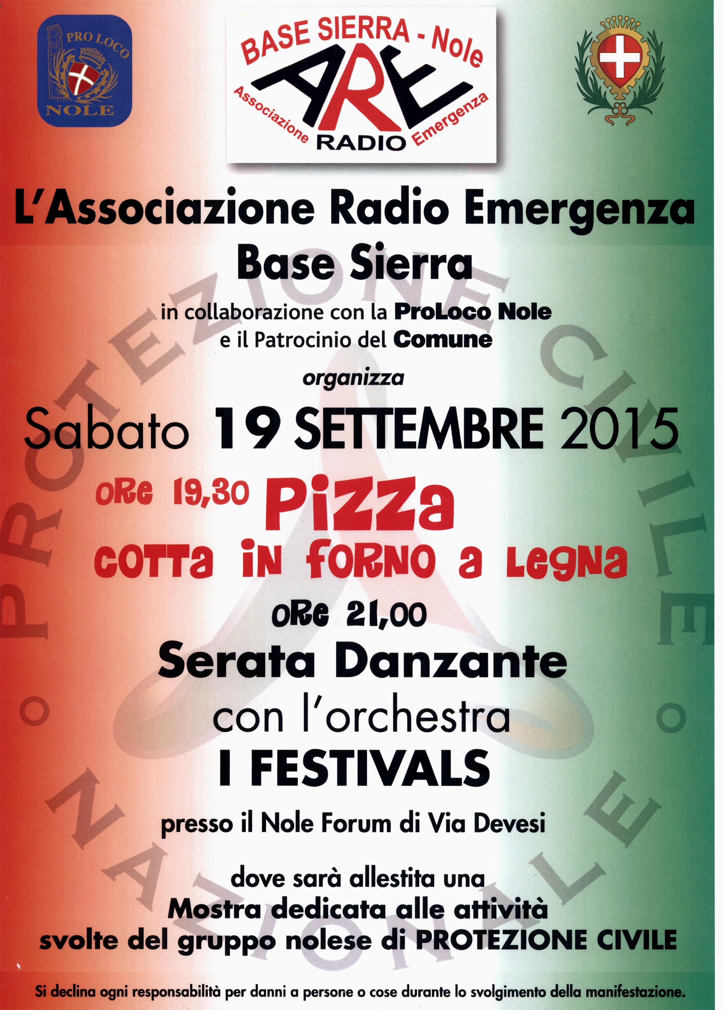 Sabato 19 settembre, presso la struttura "Nole forum" (ex Erber) di via Devesi si terrà una "serata danzante" con l'orchestra "I FESTIVALS", finalizzata alla raccolta fondi per le attività di protezione civile a cura della Associazione Radio Emergenza "Base Sierra" in collaborazione con la Pro Loco Nole.