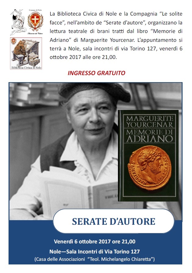 Il Comune di Nole, con la collaborazione della Biblioteca Civica di Nole e della Compagnia Teatrale "Le solite facce" organizza, nell'ambito de "SERATE D'AUTORE", la lettura teatrale di brani tratti dall'opera letteraria di Marguerite Yourcenar "Memorie di Adriano".