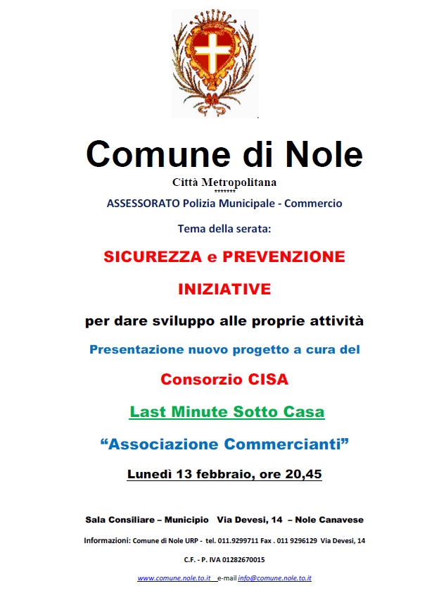 I commercianti e gli imprenditori nolesi, sono invitati a partecipare all'incontro che si terrà lunedì 13 febbraio 2017 alla serata a tema "SICUREZZA E PREVENZIONE iniziative proposte per dare sviluppo alle proprie attività - Associazione commercianti".