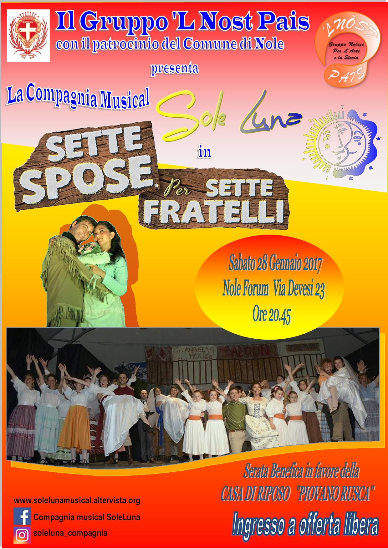 Il gruppo per l'arte e la storia "'L Nòst Pais", con il patrocinio del Comune di Nole, presenta la Compagnia Musical Sole Luna in "Sette spose per sette fratelli", serata benefica in favore della casa di riposo "Piovano Rusca".