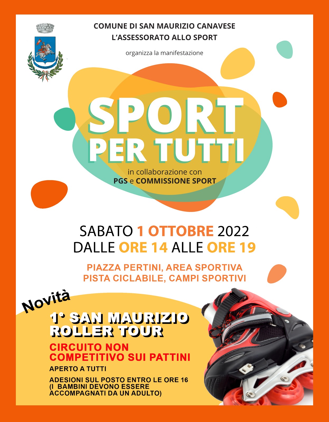 Un pomeriggio dedicato allo sport per tutti, adulti e bambini! L'appuntamento, organizzato dall'assessorato allo Sport del Comune di San Maurizio Canavese in collaborazione con PGS e Commissione Sport, è per sabato 1° ottobre, dalle 14 alle 19, nell'area di piazza Pertini, pista ciclabile e campi sportivi.