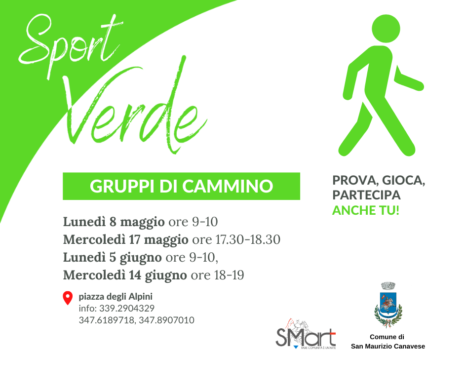 SPORT VERDE prevede poi altri tre appuntamenti con i gruppi di cammino, con ritrovo sempre in piazza degli Alpini: mercoledì 17 maggio ore 17.30, lunedì 5 giugno ore 9-10, mercoledì 14 giugno ore 18-19