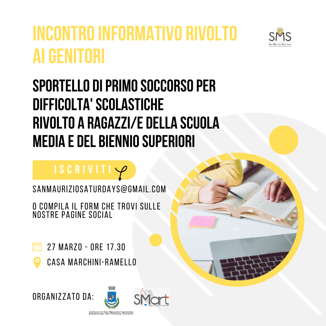 Fra le belle novità di quest'anno nell'ambito di "SMS San Maurizio Saturdays" – il grande progetto che il Comune di San Maurizio Canavese dedica ai giovanissimi del paese e alle loro famiglie – c'è lo Sportello di primo soccorso per difficoltà scolastiche. Un prezioso servizio rivolto alle ragazze e ai ragazzi della scuola media e del biennio delle superiori: si tratta di una serie di percorsi individuali dedicati ai giovanissimi dai 12 ai 16 anni con difficoltà nello studio.