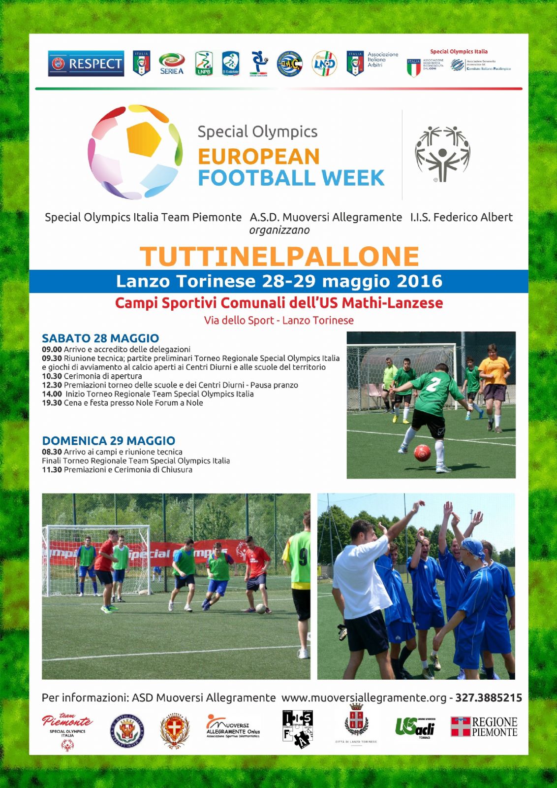L'ASD "MUOVERSI ALLEGRAMENTE" ONLUS invita alla nona edizione del calcio a 5 unificato "TUTTINELPALLONE" 2016 cha avrà luogo sul campo di calcio della "Mathi-Lanzese" a Lanzo T.se. Si terrà in due giornate poichè oltre ad essere tappa della "European Football Week" di "Special Olympics" (settimana interamente dedicata al calcio di 50 Paesi europei ed euroasiatici) avrà anche valenza di "Giochi Regionali Special Olympics".