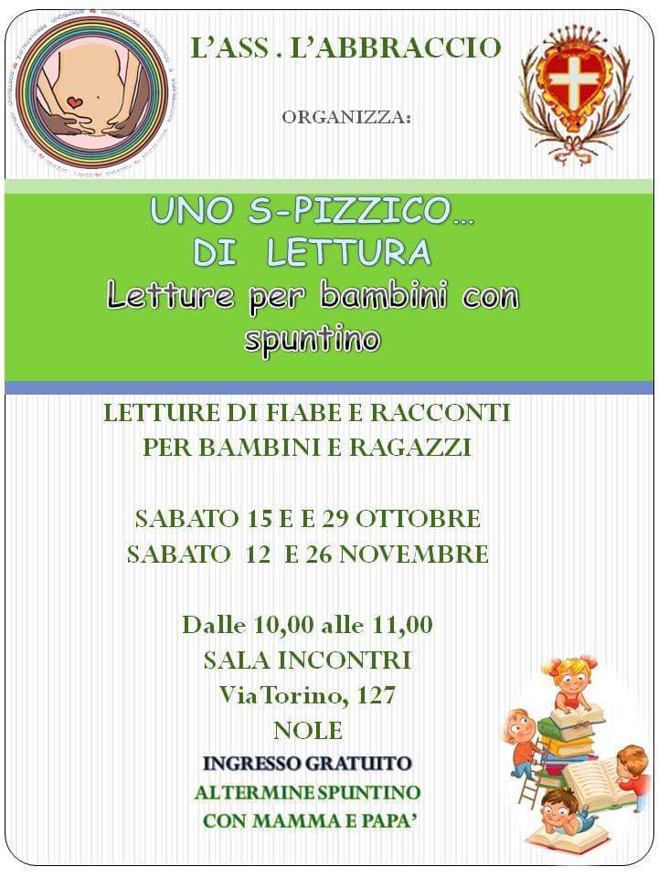 L'associazione "L'abbraccio", con il patrocinio del Comune di Nole, organizza "UNO S-PIZZICO... DI LETTURA" presso la sala incontri di via Torino 127, letture per bambini con spuntino.