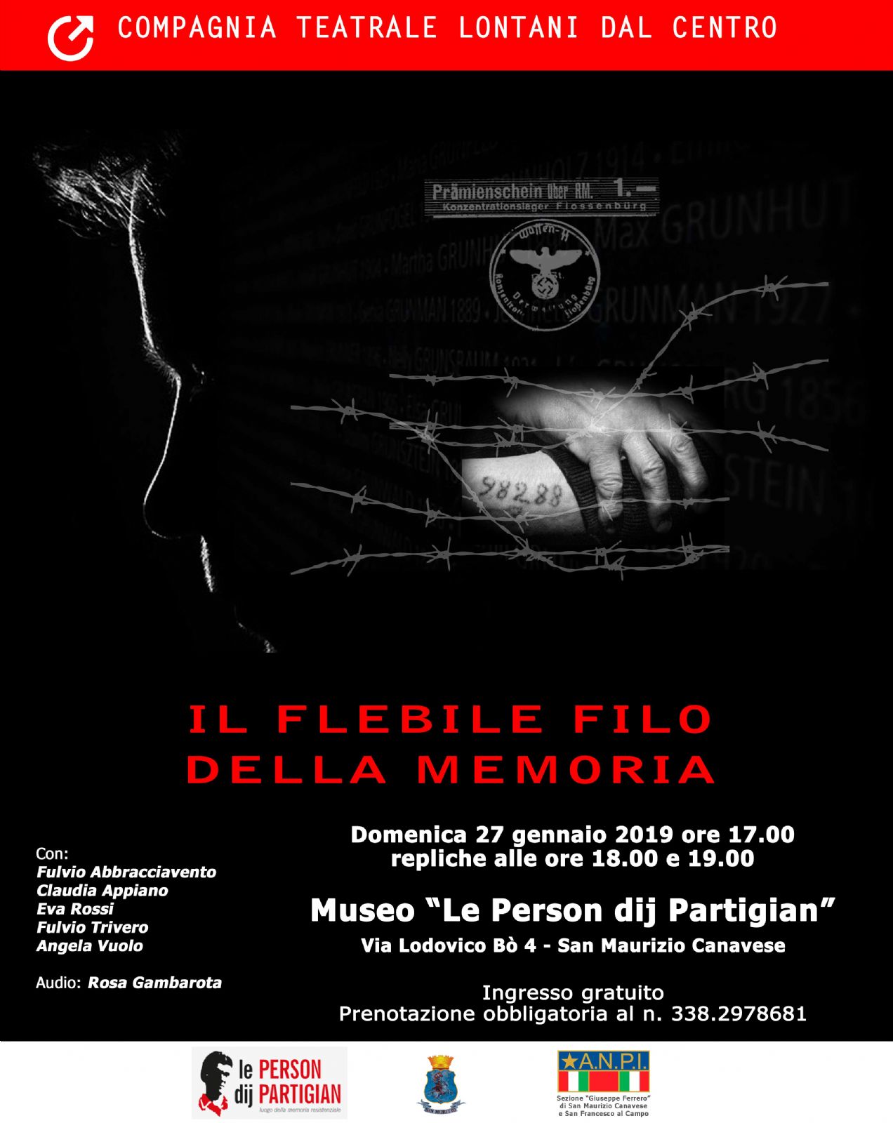 Domenica 27 gennaio, in occasione del Giorno della Memoria, l'Anpi in collaborazione e con il patrocinio del Comune di San Maurizio Canavese proporrà lo spettacolo "Il flebile filo della memoria", della compagnia teatrale Lontani dal Centro. L'appuntamento è alle Person dij Partigian (via Bo, 4) alle ore 17. Lo spettacolo sarà replicato anche alle 18 e alle 19. L'ingresso è gratuito ma, poiché i posti sono limitati, è necessario prenotare telefonando al numero 338.2978681.