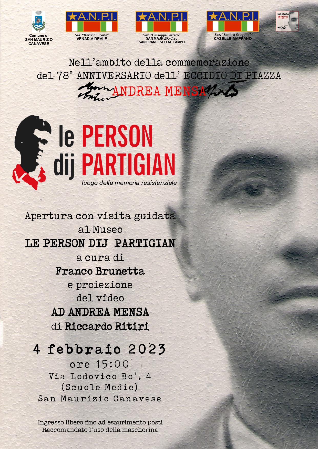 Sabato 4 febbraio, nell'ambito della commemorazione dell'eccidio di piazza Mensa (Caselle, 1° febbraio 1945), apertura con visita guidata delle Person dij Partigian di San Maurizio Canavese e proiezione del video “Ad Andrea Mensa” di Riccardo Ritiri. L'appuntamento è alle ore 15 in via Bo 4. L'ingresso è libero.