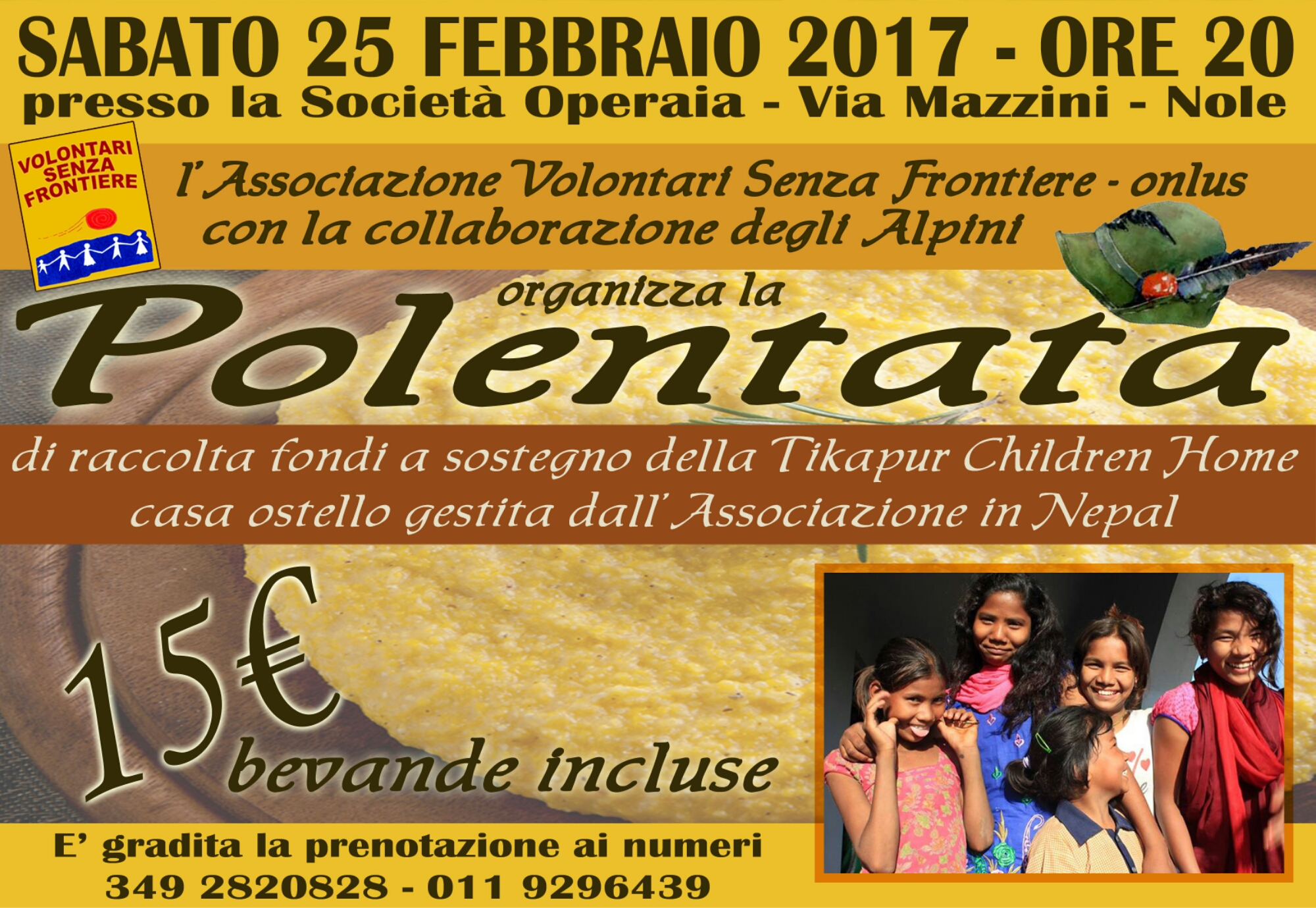 Sabato 25 febbraio 2017 alle ore 20,00, presso la Società Operaia di via Mazzini, l'Associazione Volontari Senza Frontiere, con la collaborazione dell'A.N.A. gruppo di Nole, organizza la polentata di raccolta fondi a sostegno della "Tikapur Children Home", la casa ostello gestita dalla associazione in Nepal.