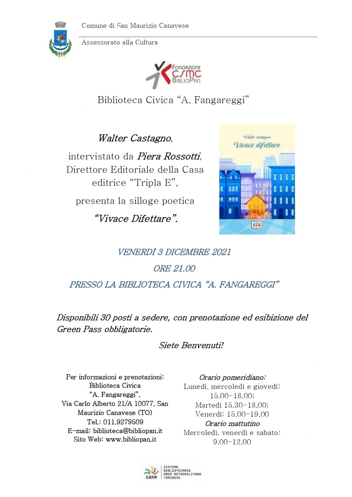 Si svolgerà venerdì 3 dicembre, alle ore 21, presso la Biblioteca Civica “Adriano Fangareggi” di San Maurizio Canavese (via Carlo Alberto, 21/a) , l’incontro con Walter Castagno, autore della Silloge Poetica “Vivace difettare”. La poesia sarà la compagna ideale per un ideale viaggio tra emozione e riflessione sulla condizione umana e non solo. L’intervista sarà curata dal Direttore Editoriale della Casa Editrice “Tripla E”, Piera Rossotti.