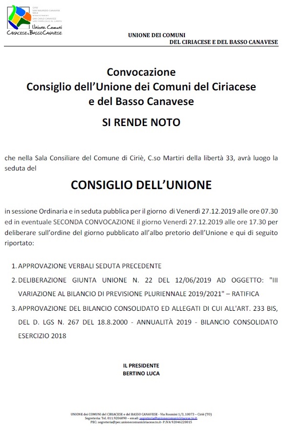 Consiglio dell'Unione dei comuni del Ciriacese e del Basso canavese indetto per il giorno 27.12.2019