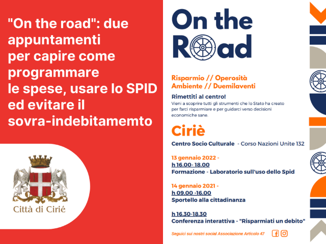 Giovedì 13 e venerdì 14 gennaio "On the road": due appuntamenti per capire come programmare le spese, usare lo SPID al meglio ed evitare il sovra-indebitamemto