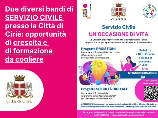 È stata posticipata alle ore 14 del 10 febbraio 2022 la scadenza per la presentazione delle domande di acesso ai due diversi progetti di servizio civile che la Città di Cirié propone attraverso la Città Metropolitana di Torino.