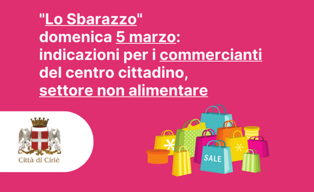 In occasione della consueta iniziativa commerciale "LO Sbarazzo" che avrà luogo domenica 5 marzo 2023, i commercianti al dettaglio del SETTORE NON ALIMENTARE con sede nell'area pedonale del centro storico cittadino (via Vittori Emanuele II, via San Ciriaco, via Fiera, via Don Lorenzo Giordano e via San Sudario) potranno occupare gli spazi antistanti le vetrine del proprio esercizio commerciale con esposizione dei propri prodotti, richiedendo autorizzazione all'occupazione suolo pubblico in via semplificata mediante invio all'indirizzo PEC suap.cirie@pec.it, entro mercoledì 1° marzo 2023, dell'apposito modello qui in allegato, nel rispetto delle prescrizioni dettagliate nello stesso