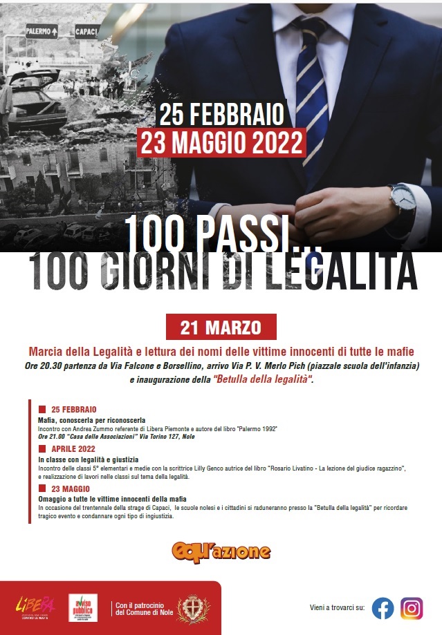 Lunedì 21 marzo 2022, in concomitanza con la giornata nazionale in memoria delle vittime innocenti delle mafie, si terrà in Nole la marcia della legalità con la lettura di tutti i nomi delle vittime innocenti di tutte le mafie.