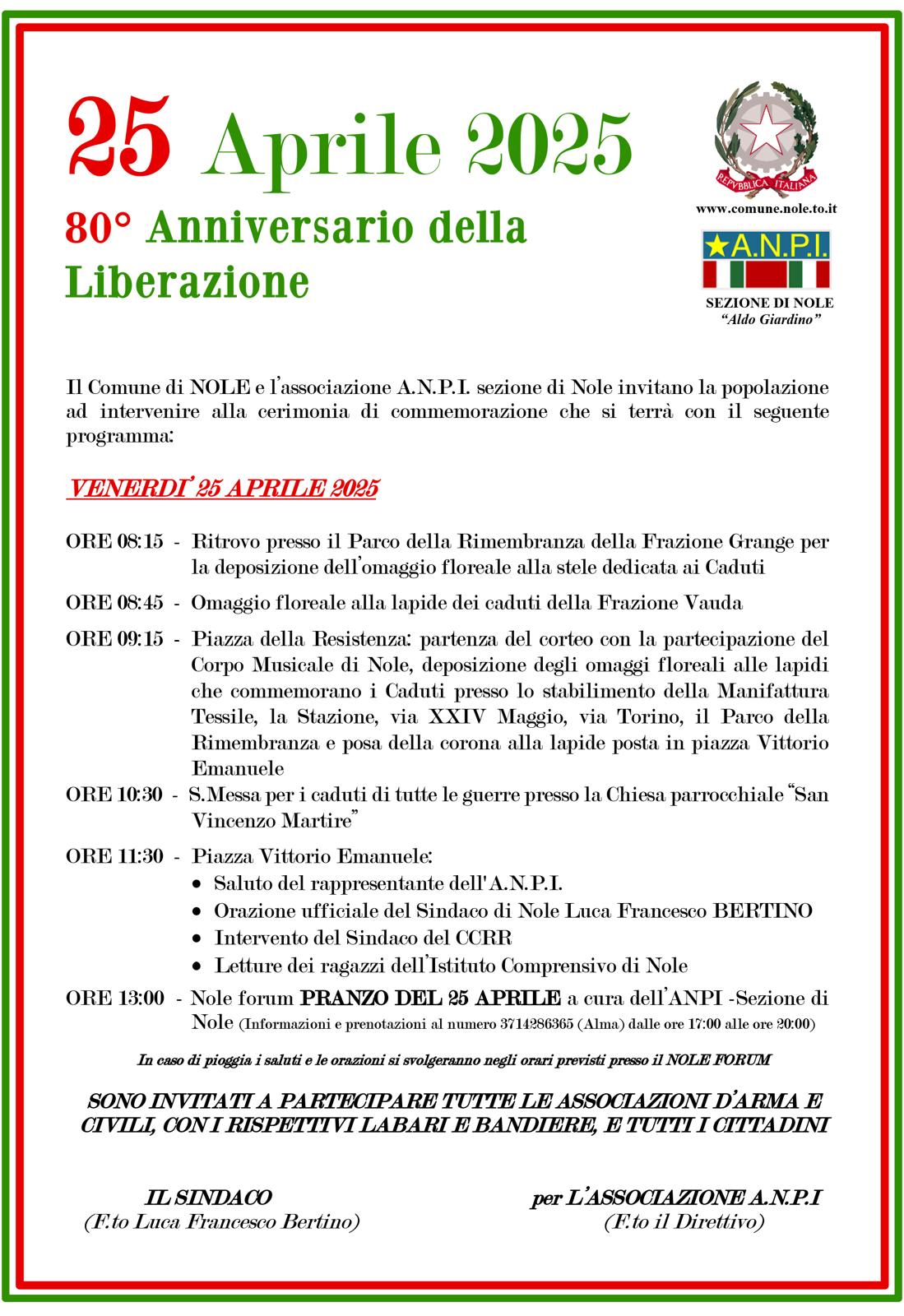 Si invita la cittadinanza a partecipare all'80° Anniversario della Liberazione. Il programma dell'evento lo trovate in allegato.