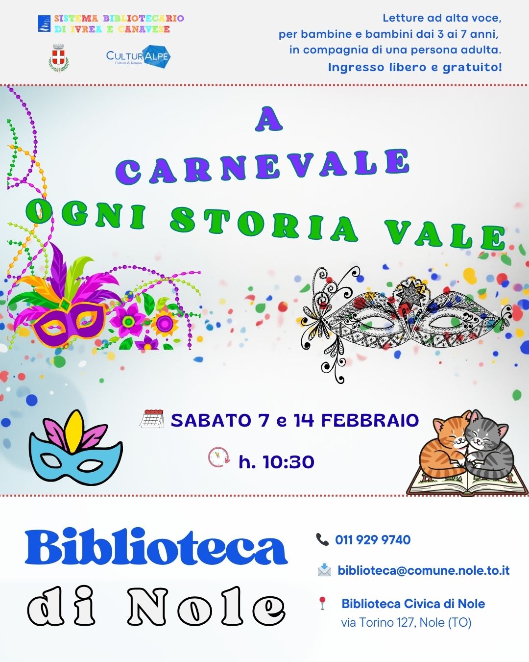 A Carnevale... ogni storia vale! Tornano le letture ad alta voce per bambine e bambine dai 3 ai 7 anni, in compagnia di una persona adulta, promosse dalla Biblioteca Civica di Nole.