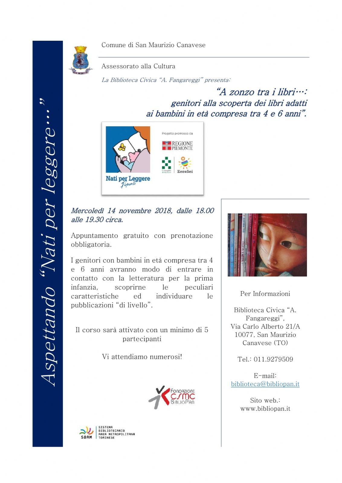 Per informazioni ed adesioni, basta rivolgersi al personale della Biblioteca in orario di apertura (dal lunedì al giovedì dalle 15 alle 18, il venerdì dalle 15 alle 19, il mercoledì, venerdì e sabato dalle 9. alle 12), oppure telefonare al numero 011.9279509 o scrivere a biblioteca@bibliopan.it.