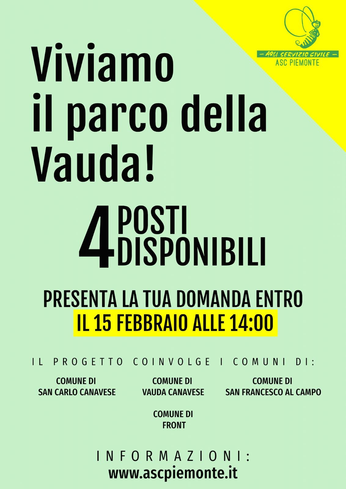 Si comunica che i Comuni di San Carlo Canavese, Vauda Canavese, San Francesco al Campo e Front, unitamente ad ARCI Servizio Civile Piemonte promuovono il progetto di Servizio Civile "Viviamo il Parco della Vauda", che prevede l'impiego di volontari del Servizio Civile per la durata di un anno. Il termine per la presentazione delle candidature è fissato per il 15 Febbraio 2021. Il giorno martedì 2 febbraio 2021 a partire dalle ore 18,00 è prevista una diretta streaming consultabile sulla pagina Facebook di e sul canale Youtube https://bit.ly/3oXpnSY di Arci Servizio Civile Piemonte e rimarrà visionabile dopo tale data. Per informazioni è possibile consultare il sito www.ascpiemonte.it