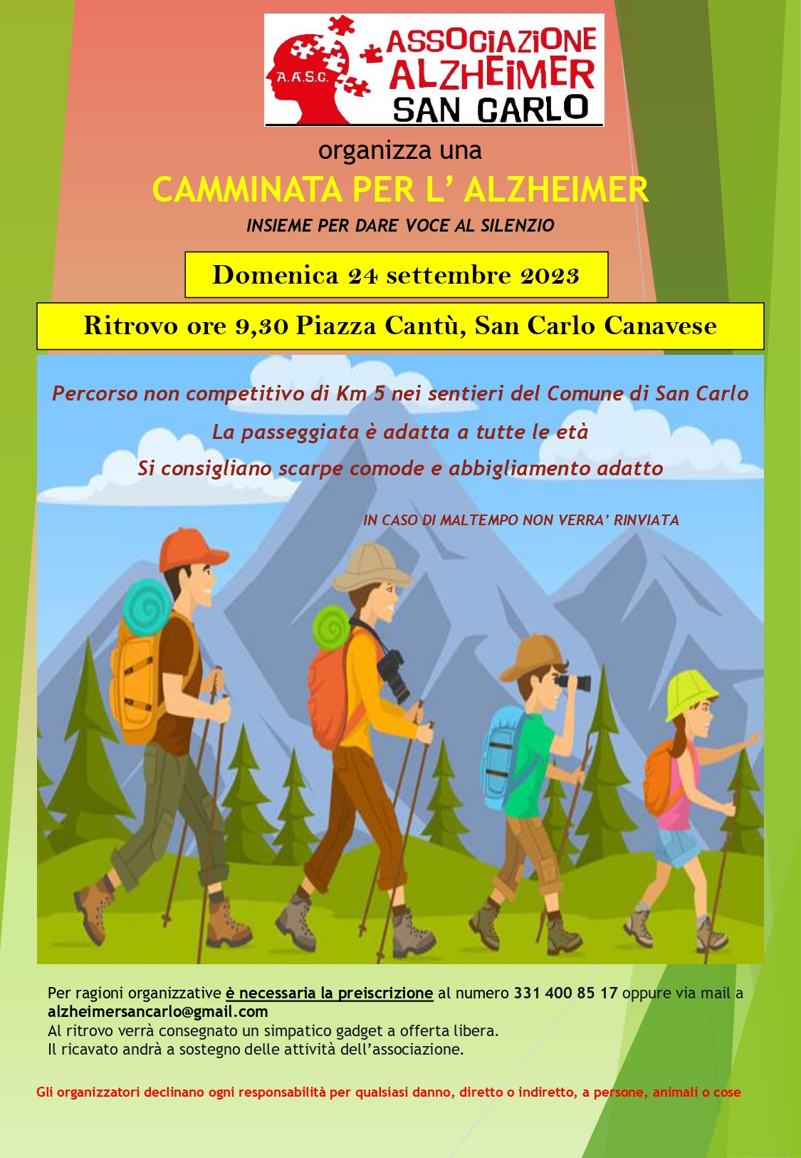 L'ASSOCIAZIONE ALZHEIMER SAN CARLO ORGANIZZA PER DOMENICA 24 SETTEMBRE 2023 UNA PASSEGGIATA DI 5 KM NEI SENTIERI DEL COMUNE DI SAN CARLO CANAVESE.