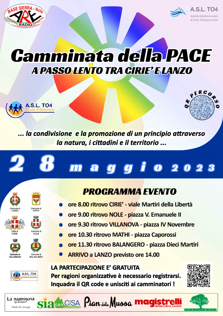 "Camminata della Pace - a passo lento tra Ciriè e Lanzo" è un evento ideato dai Gruppi di Cammino dell'ASL TO4 e dall'Associazione Radio Emergenza- Base Sierra ODV e si svolgerà domenica 28 maggio 2023.