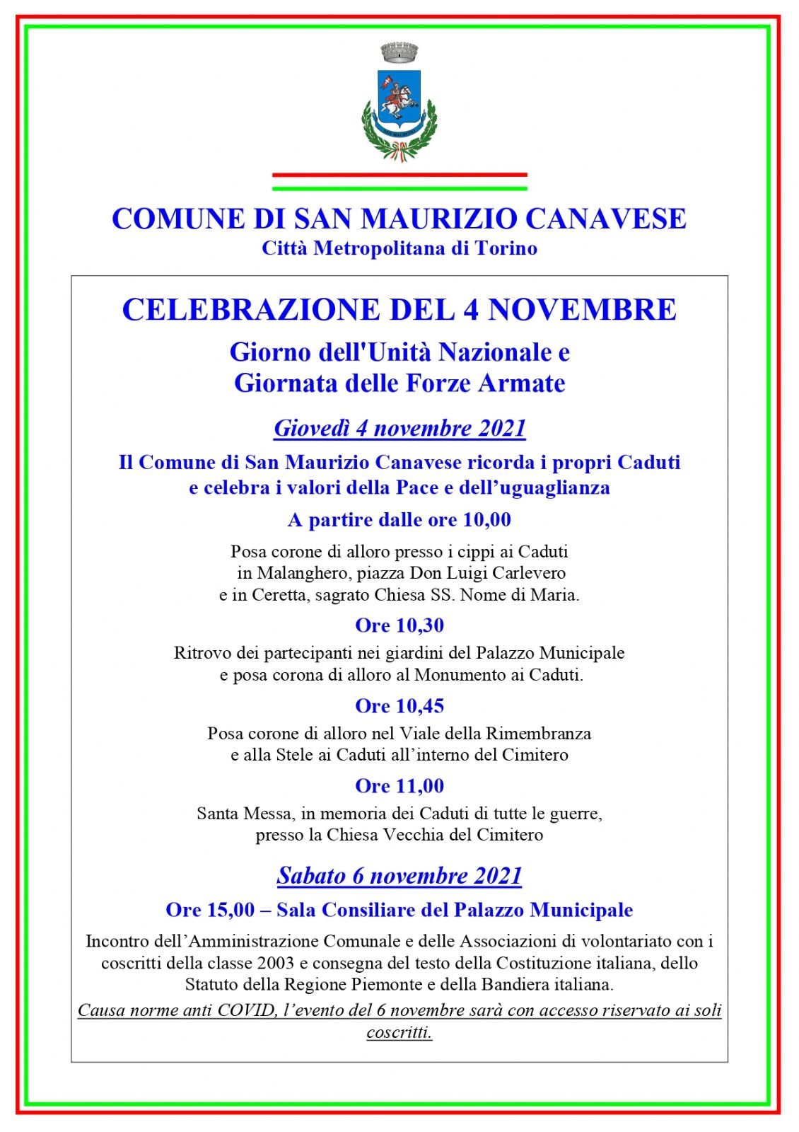 L'evento vivrà però un secondo momento molto importante nella tradizione della nostra comunità, che purtroppo l'anno scorso non è potuto svolgersi a causa della pandemia: sabato 6 novembre, alle ore 15, nella Sala Consiliare del municipio i neodiciottenni del paese (quest'anno tocca ai coscritti del 2003) incontreranno l'Amministrazione comunale, le associazioni di volontariato e riceveranno il testo della Costituzione Italiana, dello Statuto della Regione Piemonte e la bandiera italiana. Nel rispetto delle normative anti Covid, la partecipazione all'evento di sabato 6 novembre sarà riservata ai soli coscritti.