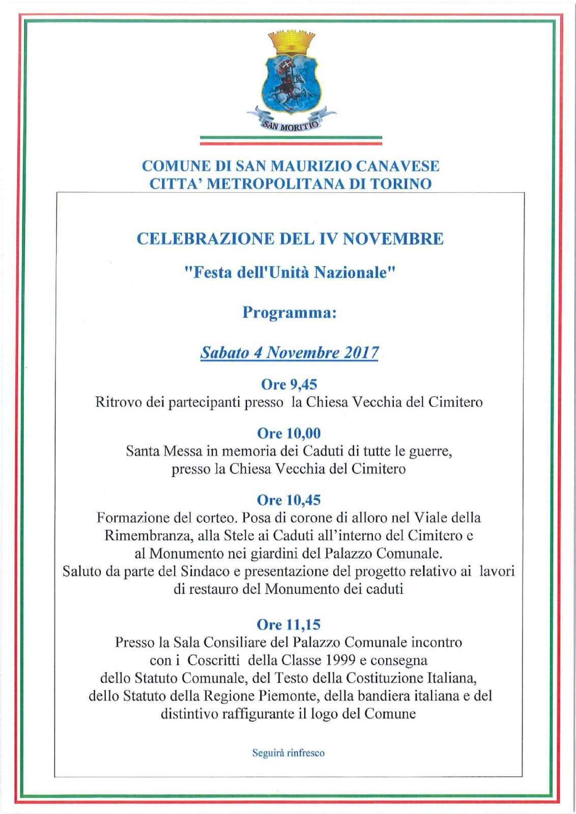 Sabato prossimo, 4 novembre, Festa dell'Unità Nazionale, il Comune di San Maurizio Canavese solennizzerà la ricorrenza con la consueta manifestazione alla qualesono invitati tutti i cittadini. L'appuntamento è alle 9.45 presso la Chiesa Vecchia del Cimitero. Alle 10.45, dopo il corteo e la posa delle corone di alloro, nei giardini del palazzo comunale sarà presentato anche il progetto dei lavori di restauro del Monumento ai Caduti. Infine, alle 11.15, nella sala consiliare del municipio il sindaco incontrerà i coscritti del 1999.
