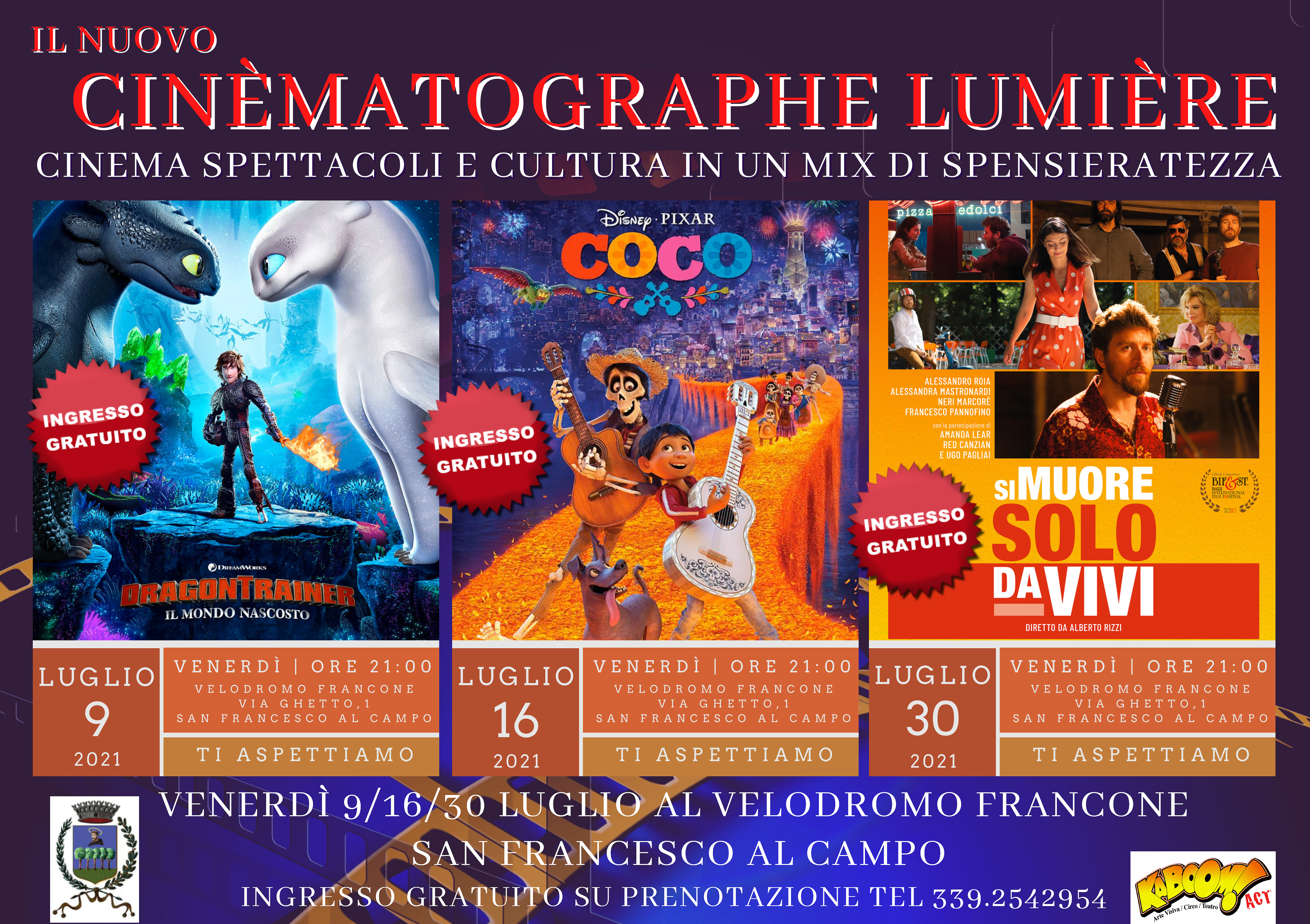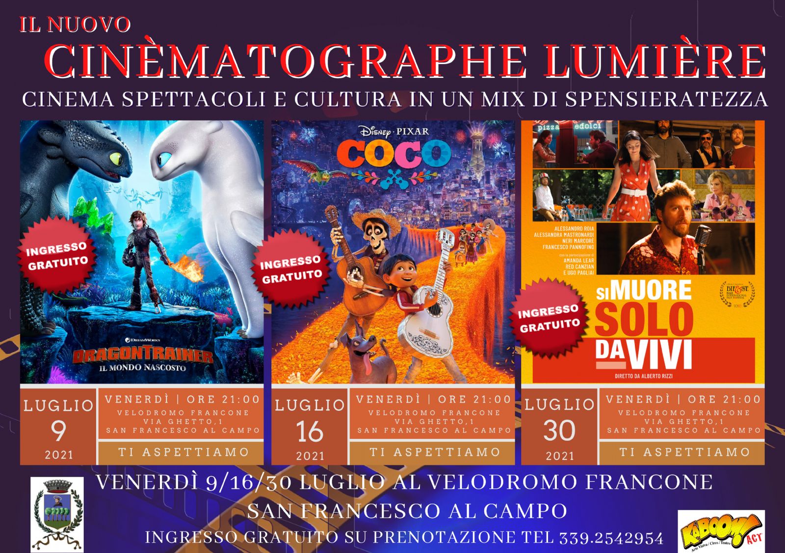 Si terranno a luglio, presso il velodromo Francone, tre venerdì sera dedicati al cinema con proiezioni all'aperto per adulti e bambini.
