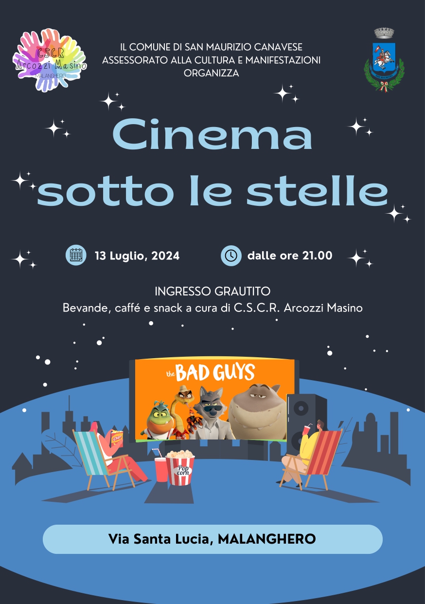 L'assessorato alla Cultura e alle Manifestazioni del Comune di San Maurizio Canavese organizza "Cinema sotto le stelle". L'appuntamento è per sabato 13 luglio alle ore 21 in via Santa Lucia a Malanghero. L'ingresso naturalmente è gratuito.