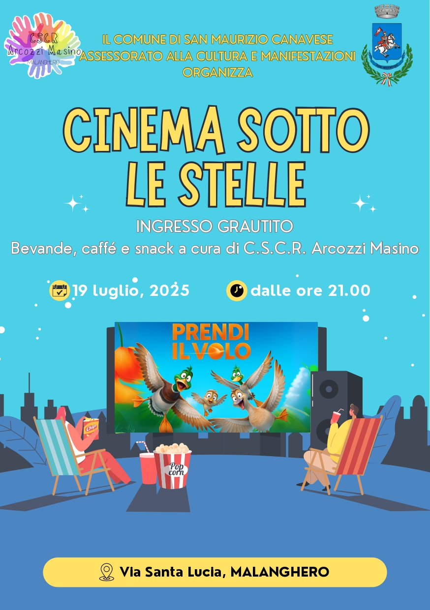 Sabato 19 luglio alle ore 21 appuntamento con il Cinema sotto le Stelle a Malanghero, organizzato dall'assessorato alla Cultura e alle Manifestazioni del Comune di San Maurizio Canavese. Bevande e snack a cura di CSCR Arcozzi Masino. Ingresso libero e gratuito.
