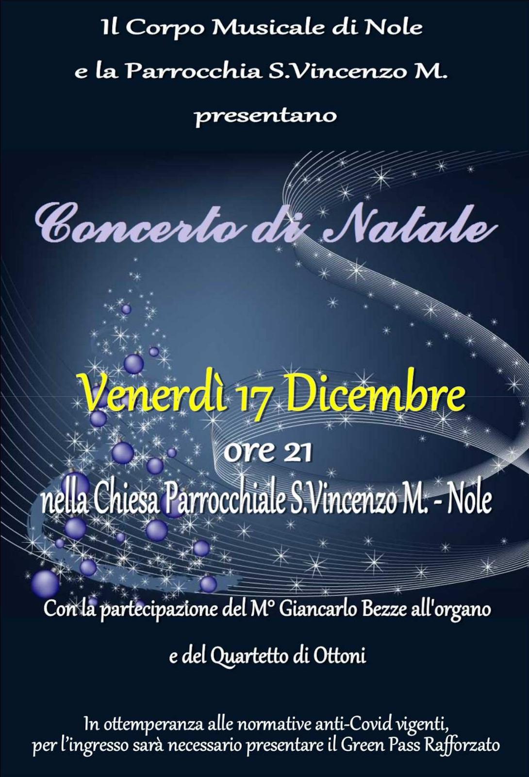 Il Corpo Musicale di Nole e la Parrocchia di S.Vincenzo Martire presentano il concerto di Natale venerdì 17 dicembre 2021 alle ore 21,00 presso la chiesa parrocchiale di S.Vincenzo Martire, con la partecipazione del Maestro Giancarlo Bezze all'organo e del quartetto di ottoni.