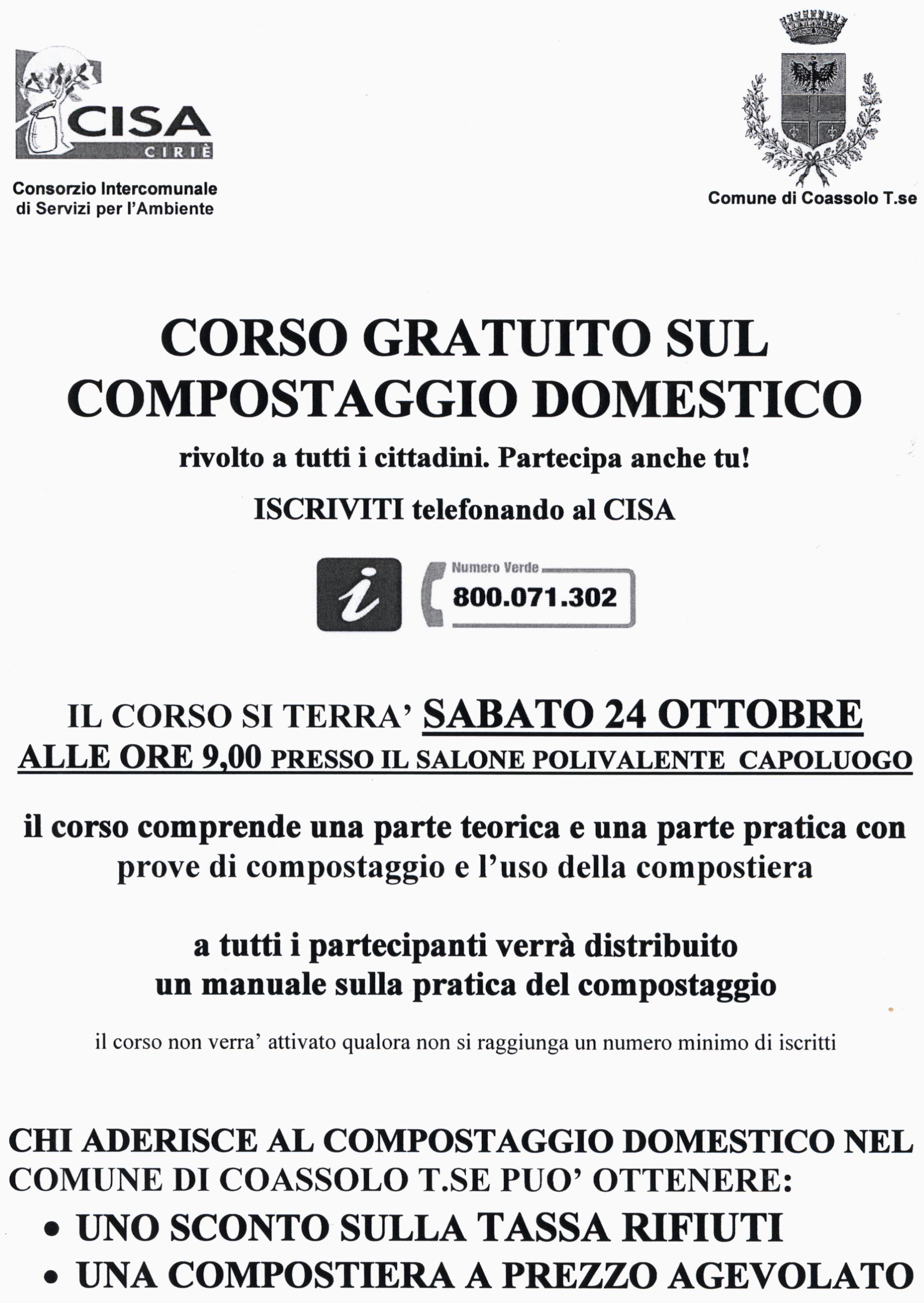 Il C.I.S.A. avvisa che si terrà un corso gratuito sul compostaggio domestico il prossimo sabato 24 ottobre 2015 alle ore 9,00 presso il salone polivalente DEL COMUNE DI COASSOLO.