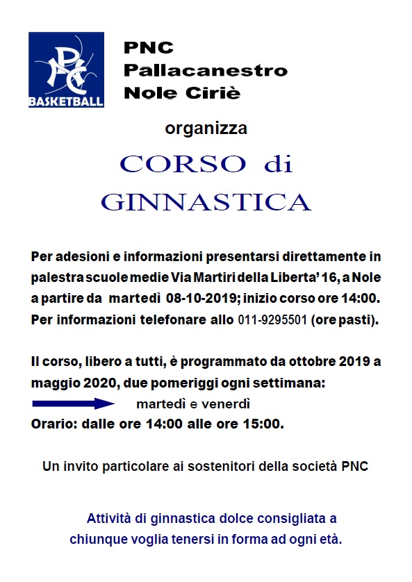 PNC (Pallacanestro Nole - Ciriè) organizza anche per il 2019/20un corso di ginnastica, libero a tutti.