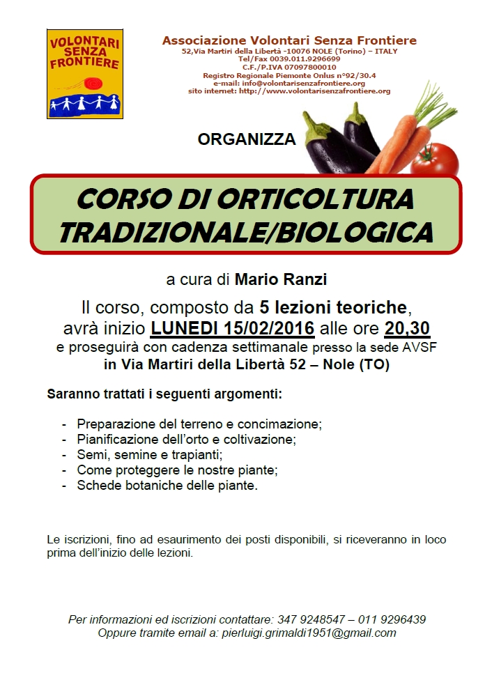 L'Associazione Volontari Senza Frontiere organizza un corso di orticoltura tradizionale/biologica a cura di Mario Ranzi. Il corso è composto da 5 lezioni teoriche ed avrà inizio lunedì 15 febbraio 2016 alle ore 20,30 e proseguirà con cadenza settimanale presso la sede di via martiri della libertà 52. Le iscrizioni si riceveranno in loco prima dell'inizio delle lezioni.