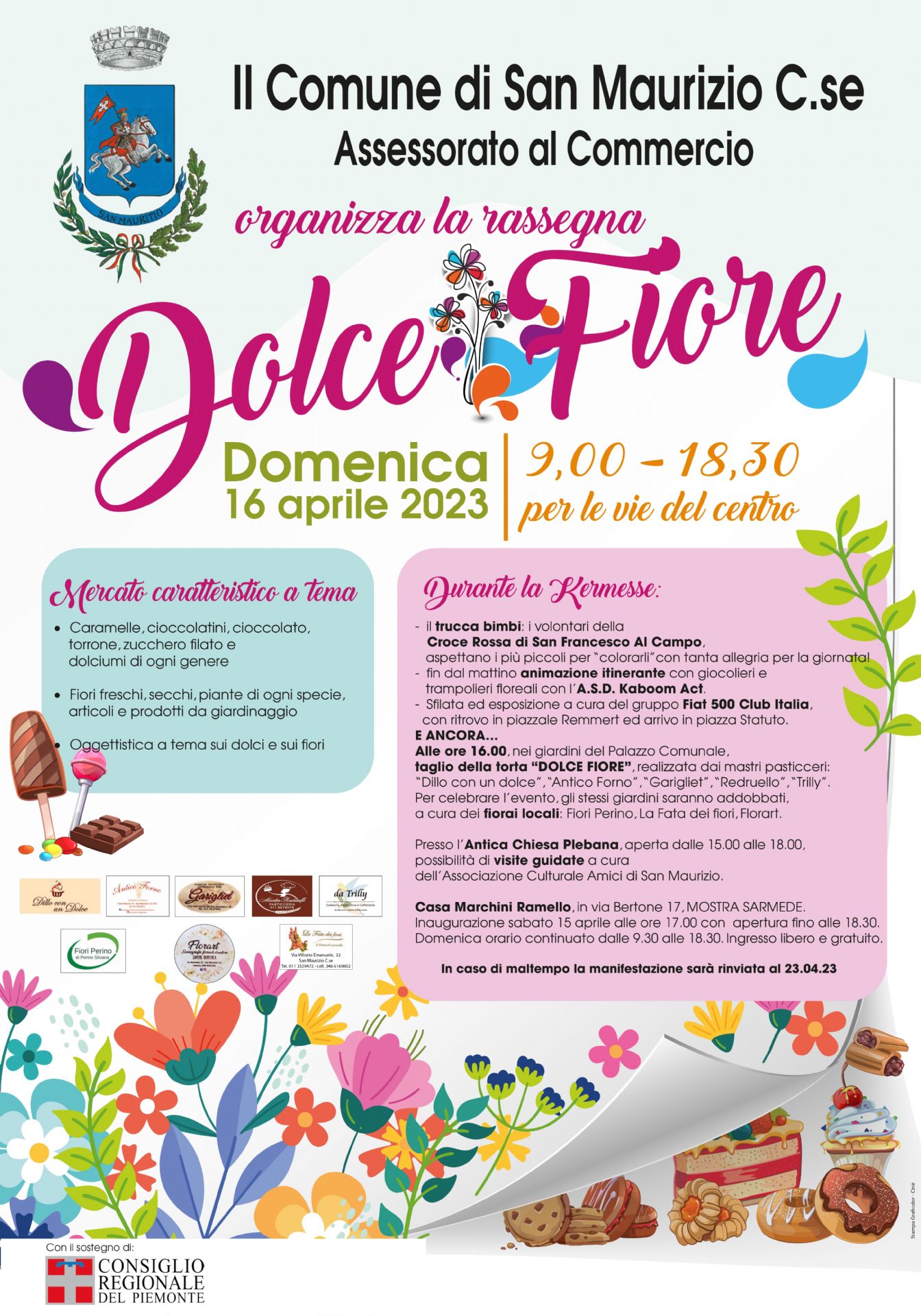 Per l'intera giornata, dalle 9 alle 18,30, le vie del centro del paese saranno animate da bancarelle di fiori, piante, articoli e prodotti da giardinaggio, caramelle, cioccolato, zucchero filato e tanti dolciumi, oltre a oggettistica a tema sui dolci e sui fiori, curiosità e sorprese per grandi e piccini.