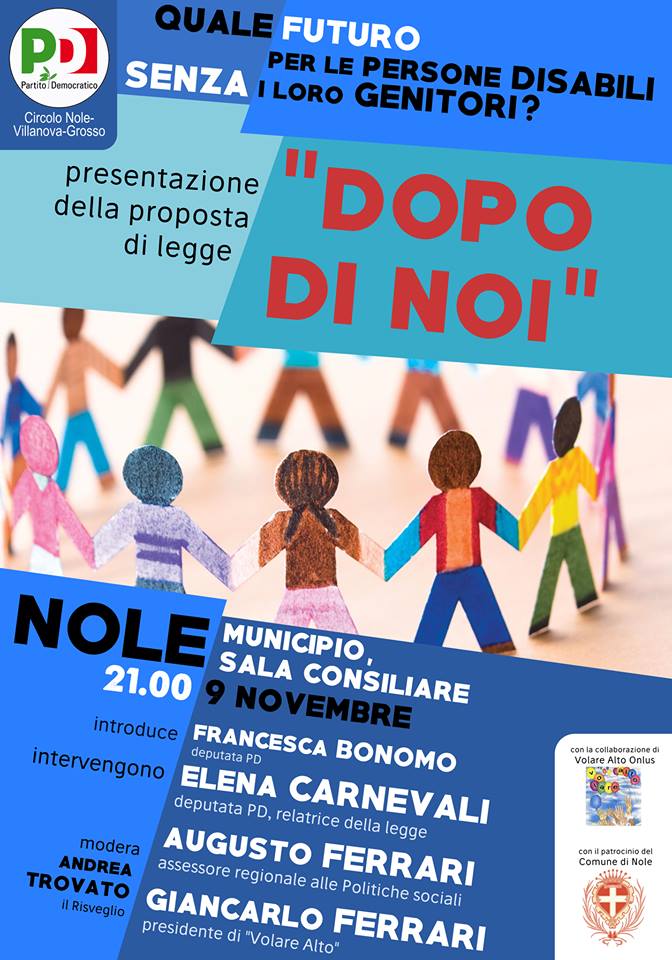 Il PD (Circolo Nole, Villanova e Grosso), con la collaborazione di "Volare Alto" ed il patrocinio del Comune di Nole organizza la presentazione della proposta di legge "DOPO DI NOI": quale futuro per le persone disabili senza i loro genitori.