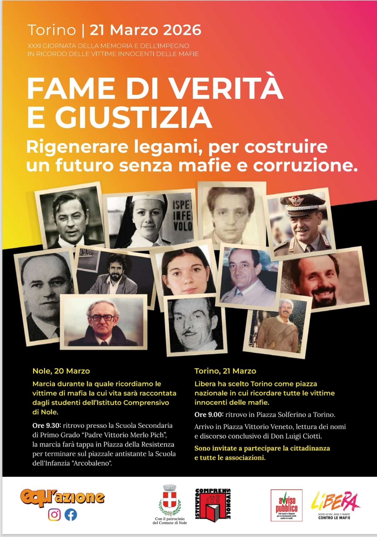 Si comincia venerdì 20 marzo con una mattinata dedicata al ricordo delle vittime innocenti delle mafie. A dare voce alla memoria saranno gli studenti dell’Istituto Comprensivo di Nole, che racconteranno le storie di chi ha pagato con la vita la lotta contro la criminalità organizzata. Il ritrovo è fissato alle 9,30 alla scuola secondaria di primo grado “Padre Vittorio Merlo Pich”: da qui partirà la marcia che attraverserà il paese, con una tappa in piazza della Resistenza, per concludersi nel piazzale della scuola dell’infanzia “Arcobaleno”. Un percorso simbolico e concreto insieme, che coinvolge le nuove generazioni e rafforza il senso di comunità.