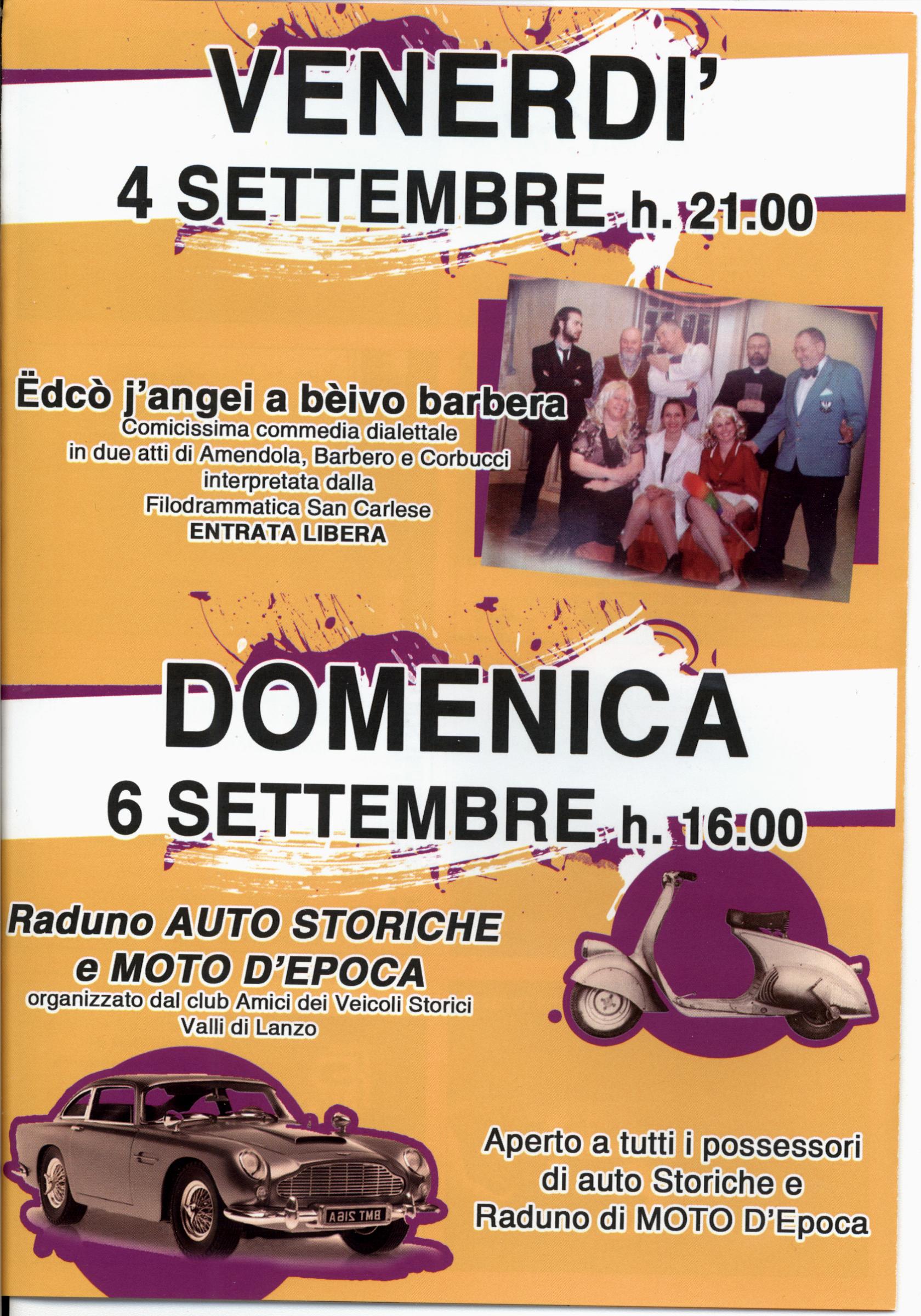 -Domenica 6 settembre 2015 alle ore 16,00 raduno di auto storiche e moto d'epoca organizzato dal club "Amici dei veicoli storici Valli di Lanzo" ed aperto a tutti i possessori di auto storiche e moto d'epoca.