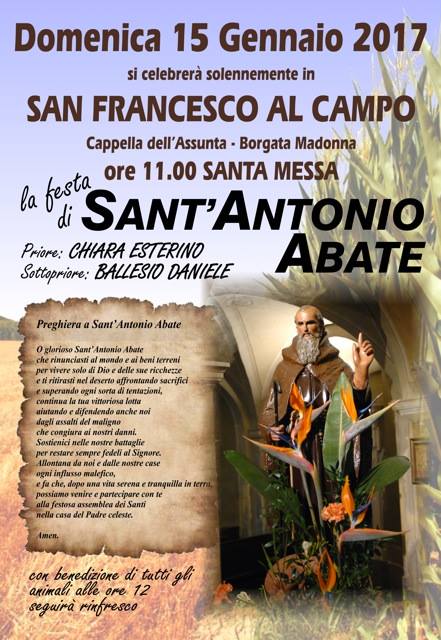 Domenica 15 gennaio, secondo l'antica tradizione di borgata Madonna, sarà celebrata la festa di Sant'Antonio Abate. L'appuntamento è nella cappella dell'Assunta alle ore 11 per la messa solenne con il priore Esterino Chiara e il sottopriore Daniele Ballesio. Alle 12 la benedizione degli animali sul piazzale antistante la cappella. Seguiranno il rinfresco e il pranzo.