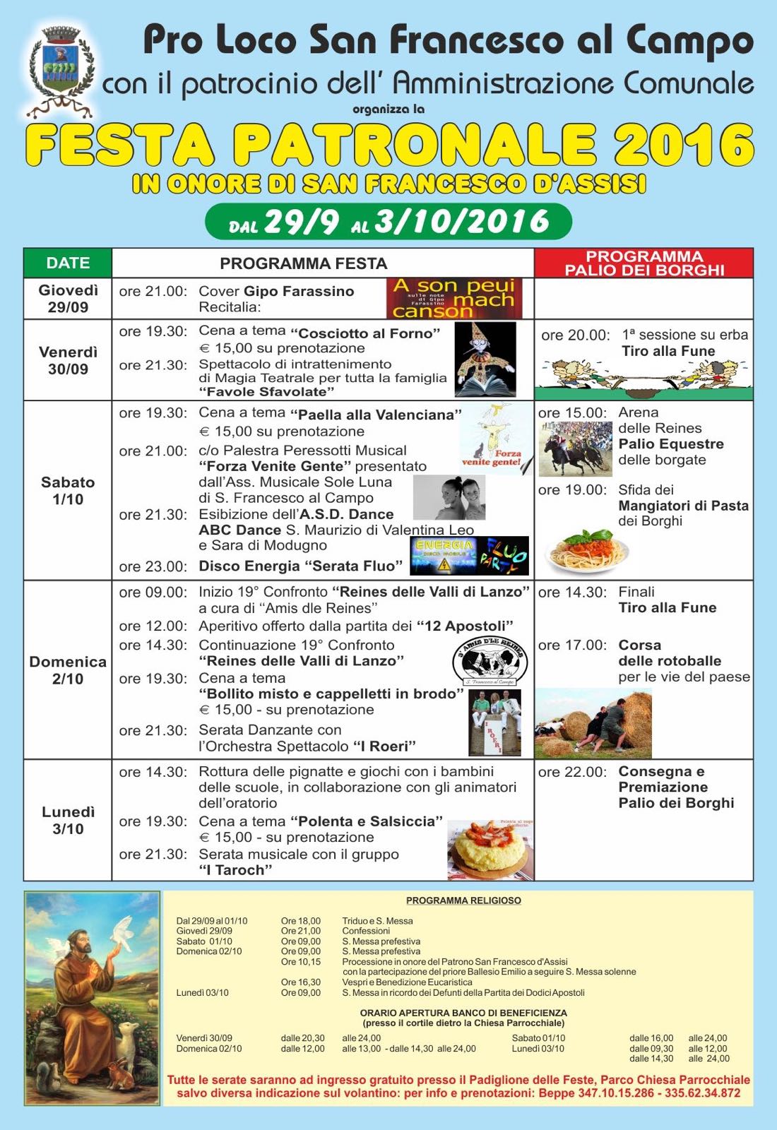 “Quest'anno puntiamo al rilancio della festa Patronale – commenta Giorgio Candelo, consigliere comunale delegato alle Manifestazioni – Si tratta della prima edizione organizzata dalla neonata Pro Loco, costituitasi nei mesi scorsi e già impegnatasi con successo nell'organizzazione della Festa del Cavallo. L'Amministrazione comunale, come sempre, concede il patrocinio e un contributo economico, ma quest'anno contiamo molto sulle competenze, l'impegno e l'entusiasmo delle donne e degli uomini della Pro Loco. A loro, in particolare, il compito di rilanciare in grande stile il Palio dei Borghi, rinato un anno fa, dopo i fasti del passato, grazie all'impegno e all'iniziativa di alcuni volonterosi cittadini. Invito i sanfranceschesi a partecipare alle tante iniziative in programma. Buona Patronale a tutti!”.