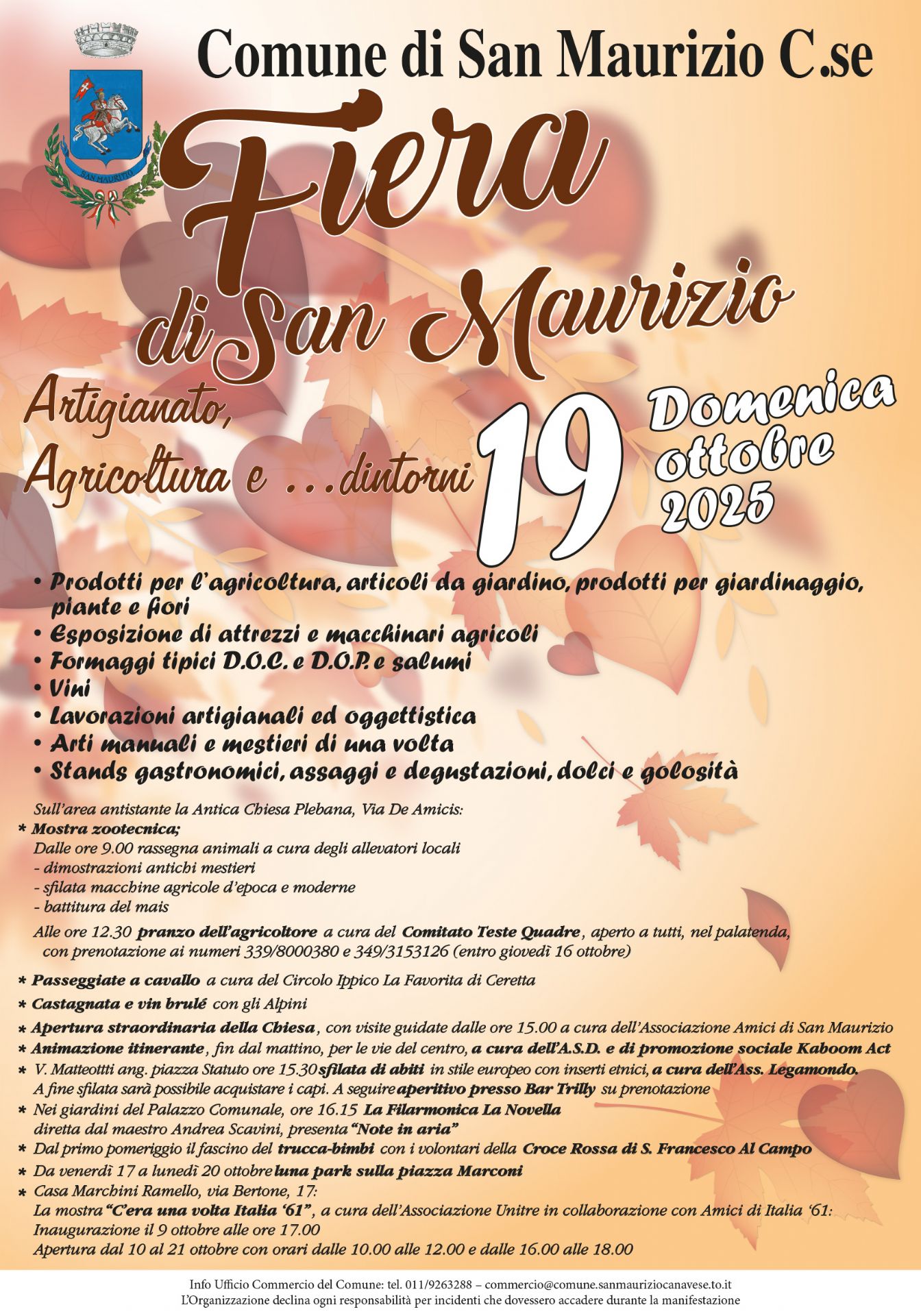 Si svolgerà domenica 19 ottobre la Fiera di San Maurizio "Artigianato, Agricoltura e dintorni", la tradizionale sagra d'autunno organizzata dal Comune di San Maurizio Canavese. Gli appuntamenti avranno inizio fin dal primo mattino e copriranno l'intera giornata.