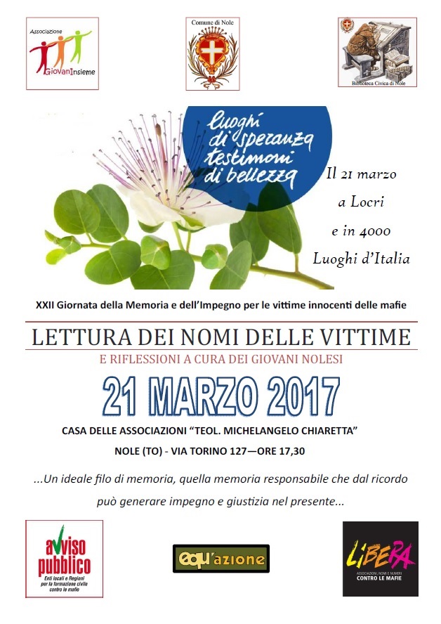 Il Comune di Nole, in collaborazione con la Biblioteca Civica di Nole, l'Associazione Giovaninsieme, Avviso Pubblico, Equ'azione, Libera, in concomitanza con la XXII Giornata della Memoria e dell’Impegno per le vittime innocenti delle mafie, organizza la LETTURA DEI NOMI DELLE VITTIME con le riflessioni a cura dei giovani nolesi.