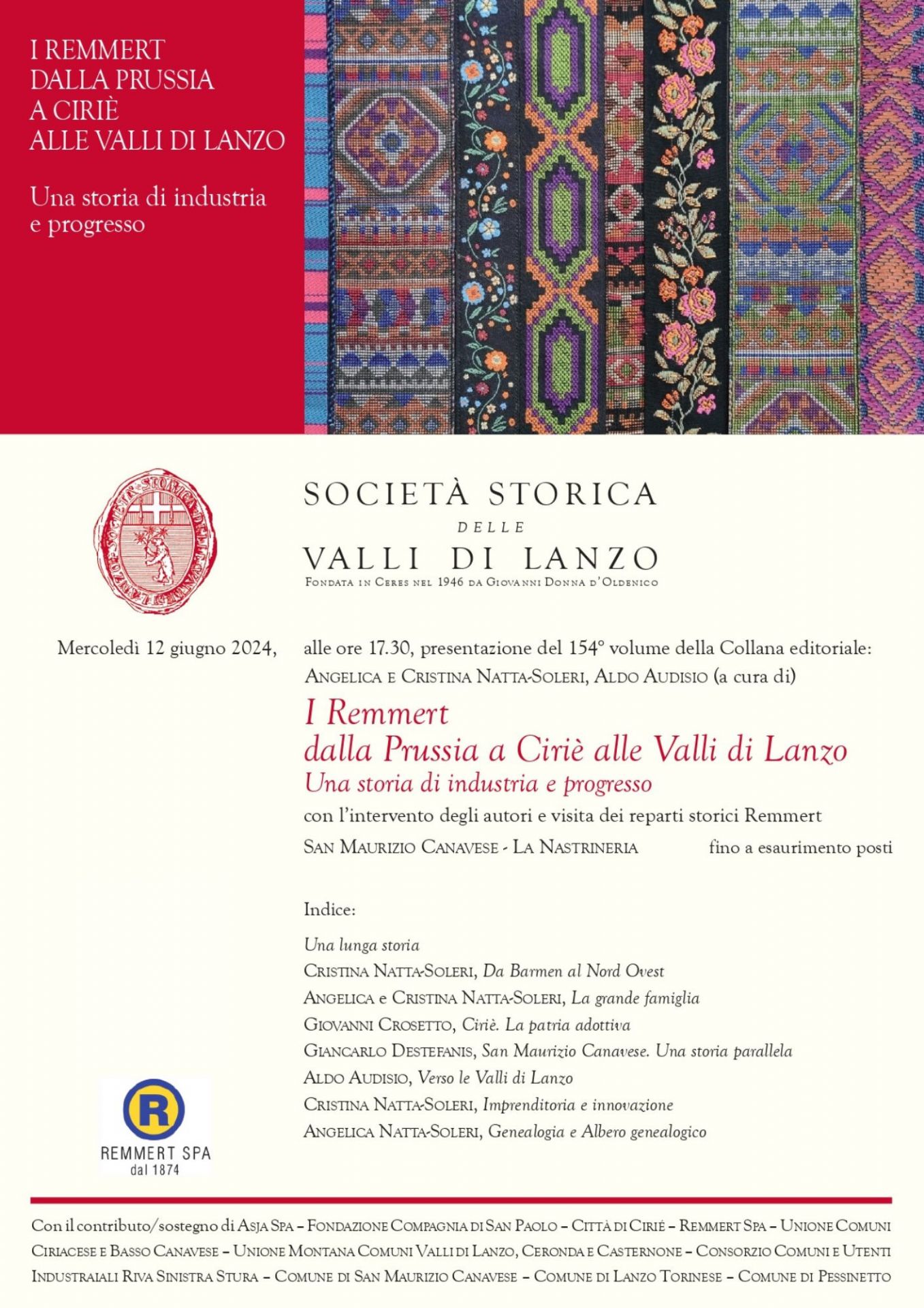 Mercoledì 12 giugno alle ore 17.30 presso la Nastrineria (via Remmert, 20) sarà presentato il volume "I Remmert dalla Prussia a Ciriè alle Valli di Lanzo" a cura di Angelica e Cristina Natta-Soleri e di Aldo Audisio, con l'intervento degli autori e la visita dei reparti storici Remmert. L'ingresso è libero fino a esaurimento posti.