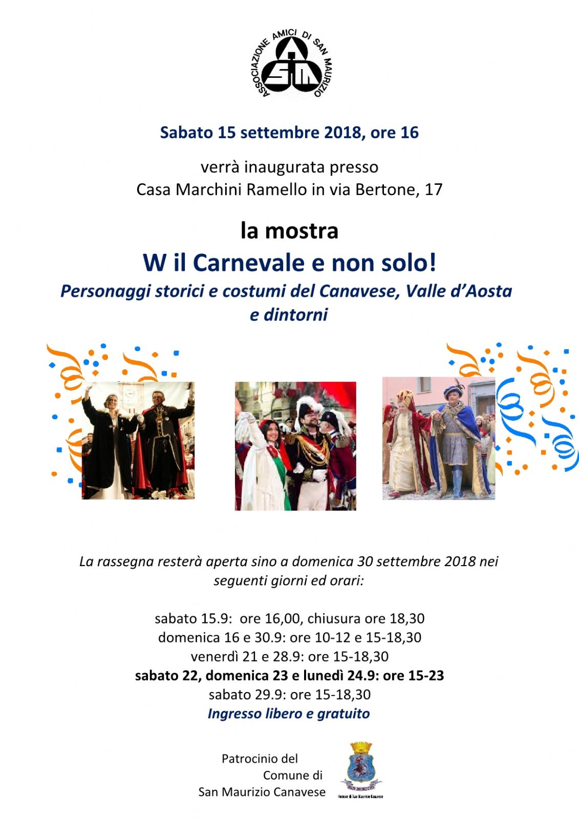 Tempo di Carnevale? No, tempo di patronale, ma è pur sempre festa. E allora, in attesa del Carnevale 2019, immergiamoci nella storia e nella tradizione carnascialesca del territorio. L'opportunità ci è offerta dall'associazione Amici di San Maurizio, che in occasione della festa patronale ha organizzato la mostra "W il Carnevale e non solo! - Personaggi storici e costumi del Canavese, Valle d'Aosta e dintorni". La rassegna sarà inaugurata sabato prossimo, 15 settembre, alle ore 16, nei locali di Casa Marchini Ramello (via Bertone, 17) e resterà aperta fino a domenica 30 settembre.