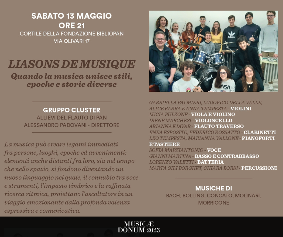Alle ore 21, cortile della Fondazione CSMC BilioPan (via Olivari, 17). Il gruppo formato dagli allievi del Flauto di Pan, il laboratorio musicale sanmauriziese che da anni offre ai bambini la possibilità di avvicinarsi con gradualità e piacere all'esperienza musicale, presenta Liaisons de musique. Quando la musica unisce stili, epoche e storie diverse, con musiche di Bach, Bolling, Concato, Molinari e Morricone.